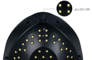 Tot datorită acestui număr mare de LED-uri UV, uscarea se face uniform fără a fi nevoie să miști mâna în lampa UV. Cu alte cuvinte, soluțiile sunt atacate cu acest tip de raze UV din toate unghiurile, pătrunzând în fprofunzime, uniform pe toată suprafața unghiei.